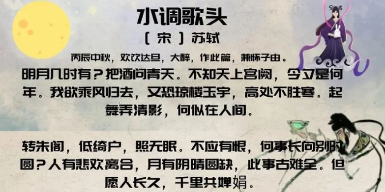 míng yuè jǐ shí yǒu ?bǎ jiǔ wèn qīng tiān 。 明月几时有?把酒问青天。 bú zhī tiān shàng gōng què ,jīn xī shì hé nián 。 不知天上宫阙,今夕是何年。 wǒ yù chéng fēng guī qù ,yòu kǒng qióng lóu yù yǔ , 我欲乘风归去,又恐琼楼玉宇, gāo chù bú shēng hán 。qǐ wǔ nòng qīng yǐng ,hé sì zài rén jiān 。 高处不胜寒。起舞弄清影,何似在人间。 zhuǎn zhū gé ,dī qǐ hù ,zhào wú mián 。 转朱阁,低绮户,照无眠。 bú yīng yǒu hèn ,hé shì cháng xiàng bié shí yuán ? 不应有恨,何事长向别时圆? rén yǒu bēi huān lí hé ,yuè yǒu yīn qíng yuán quē , 人有悲欢离合,月有阴晴圆缺, cǐ shì gǔ nán quán 。dàn yuàn rén cháng jiǔ ,qiān lǐ gòng chán juān 。 此事古难全。但愿人长久,千里共婵娟。